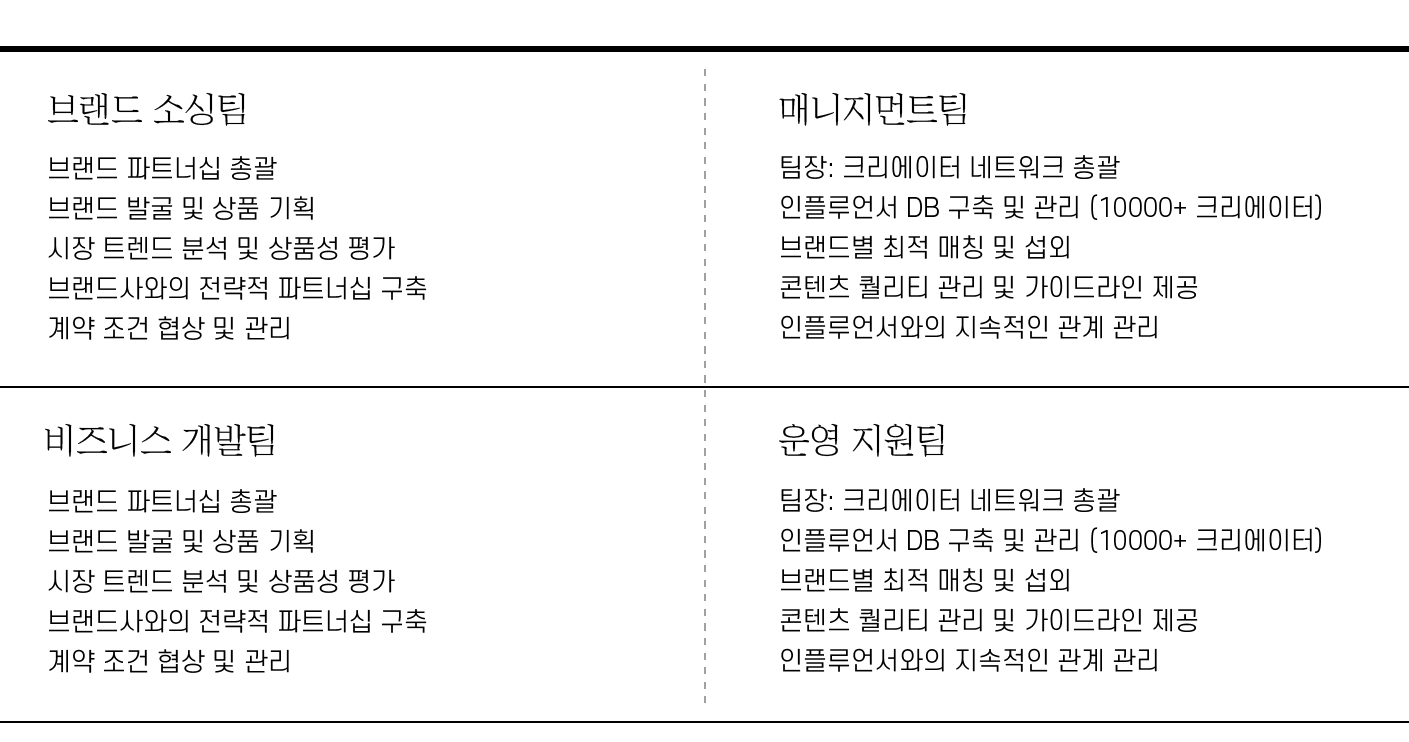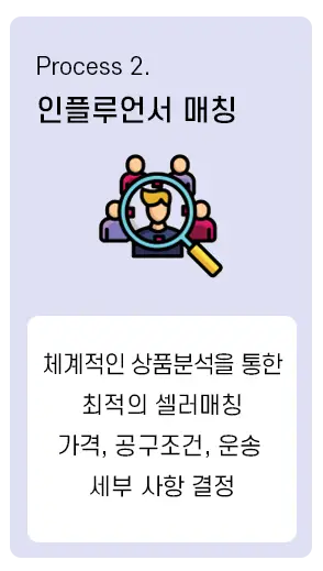 트렌드 분석, 상품 기획, 인플루언서 섭외, 마케팅 실행, 공동구매 진행, 정산 공동구매 진행을 위한 A TO Z 원스톱 솔루션을 제공하여 투명하고 신뢰할 수 있는 파트너십을 만들어갑니다.